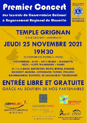 L'édition 2021 du Premier Concert des Lauréats du Conservatoire National à Rayonnement Régional de Marseille c'est ce jeudi 25 novembre 2021 à 19h30 au Temple Grignan (Marseille 6e). Entrée libre et gratuite ![]() |