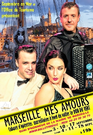Marseille mes amours Dimanche 17 septembre 2017 Lundi 18 septembre 2017 19h / Durée : 1h10 Voilier << Le Don du Vent>> Bateau (~ 90 places) Quai d'Honneur de la Mairie de Marseille Tarif : 15€ Récital mettant en avant le répertoire de l'Opérette Marseillaise des années 1930, de Vincent Scottoet de René Sarvil.![]() Ce récital au style délicieusement rétro, conçu par Jean-Christophe Born, met à l'honneur le fabuleux répertoire de l'Operette Marseillaise. Trois en scène : Perrine, la sémillante soprano au charme absolu, Jean-Christophe, le ténébreux ténor aux yeux de velours et Cyril le dur de dur de l'accordéon. Ils sont inclassables. Des artistes singuliers et un spectacle décoiffant vous ferons replonger dans le mythique Marseille des années 30, au travers de larges extraits des joyeuses opérettes marseillaises. Conçu sous la forme "cabaret", ce bijou de spectacle se décline en trois parties, aux titres évocateurs : Le coup de foudre, Aimer dans Marseille le jour, Aimer dans Marseille le soir... On retrouve avec bonheur la spirituelle Miette d'Au pays du Soleil, on se livre au Plaisir de la pêche, non loin Les Îles d'or... On rejoint le Petit cabanon " pas plus grand qu'un mouchoir de poche ", on s'extasie sur La Canebière qui ne cesse de faire le tour du monde ! On peut aussi apprécier À petits pas, et danser La valse du Racati, Youpi !, sautillante à souhait, comme dans un film en noir et blanc... L'amour est une étoile qui fait fondre Les durs de durs... C'est là toute une mythologie marseillaise de gangsters au grand coeur, de durs un peu fleur bleue, d'amoureux de la galéjade, qui renaît là, avec humour, délicatesse et élégance. Quel plaisir d'aborder ainsi notre ville ! Avec : Perrine Cabassud, soprano Jean-Christophe Born, ténor Cyrille Muller à l'accordéon Florilège d'extraits des joyeuses opérettes marseillaises : " Trois de la Marine", "Les Gangsters du château d'If", "Un de la Canebière", "Au pays du soleil" ,"Marseille mes amours". Une véritable plongée dans le passé des années 30!? Programme : A petit pas – Au pays du Soleil – Scotto Et ça fait boom – Marseille mes amours – Sellers Mon coeur vient de prendre un coup de soleil – Les g. du Ch. Miette – Au pays du Soleil –Scotto La valse du Racati, Youpi– Les gangsters du Château d'If Le plaisir de la pêche – Les gangsters du Château d'If Les Iles d'or – Les gangsters du Château d'If – Scotto J'aime la mer comme une femme - Les g. du Château d'If Un petit cabanon – Un de la Canebiere – Scotto Tout autour de la Corniche – Un de la Canebiere – Scotto Canebiere – Un de la Canebiere - Scotto A Marseille un soir - Fox Trot – Scotto L'amour est une étoile – Trois de la marine –Scotto Depuis j'ai peur de tout – Trois de la marine - Scotto Les mots d'amour – Les gangsters du Château d'If – Scotto Final: •Marseille mes amours – Marseille mes amours Et sur place le jour même (Attention, le nombre de places est limité) Tarif : 15€, réduction groupes - Res : 06 25 02 36 79 |